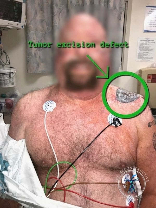 Resection with wide margins leaves a substantial defect of the temple, not amenable to primary closure. Skin grafting would create a bald patch.